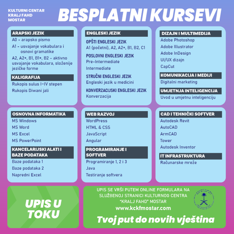 Upis na besplatne certificirane kurseve iz arapskog i engleskog jezika, kaligrafije i informatike za odrasle je u toku !